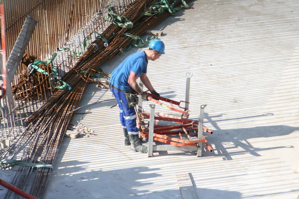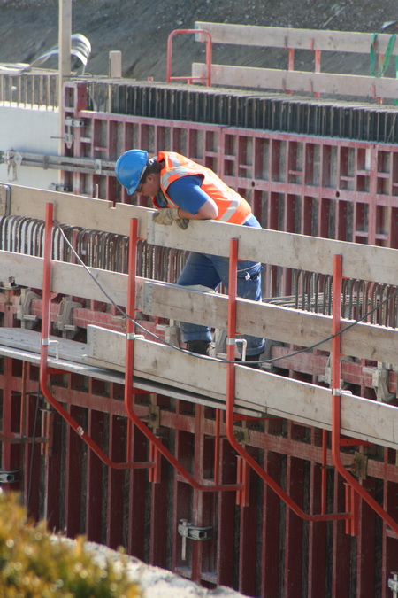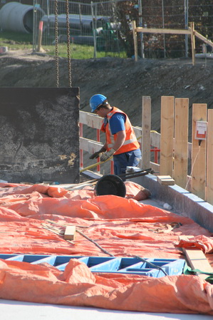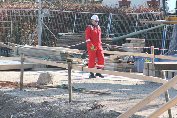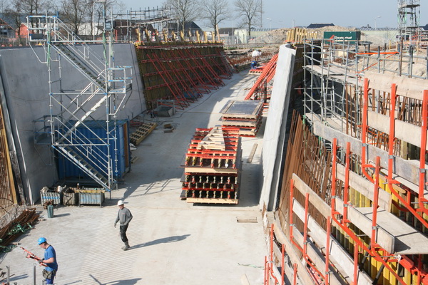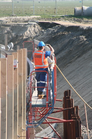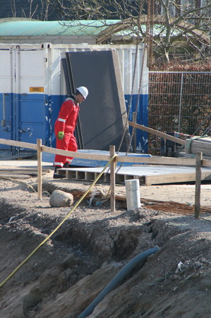 Het podium, gevormd door tunnelkuip noordwest, wordt ook niet bijster druk bevolkt, aan het eind van deze prachtige maartse morgen… Een bekistingsmateriaalopberger ruimt op…