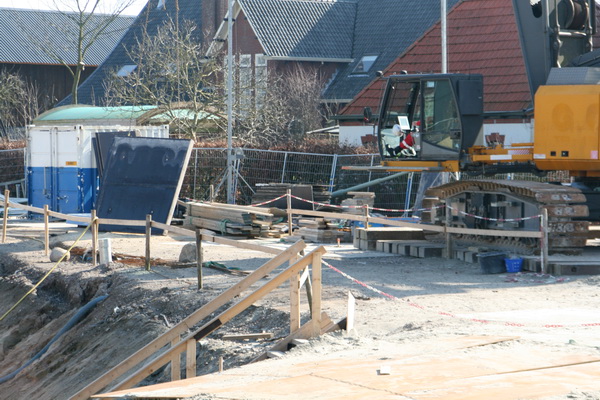 De kraanmachinist legt het paneel op een (voorlopig?) geschikte plek neer. Nee, een ontvangstcomité is er niet…..