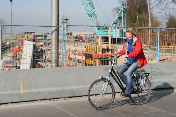 Intussen fietst huismoeder en badjuf Paula zonnig over de “snelweg”, supersnel op haar Gazelle… (Zoonlief gaat gehoorzaam over het fietspad…) Deze week kan dit nog. Vanaf volgende week is deze afslag gestremd. Duurt naar verwachting ongeveer twee weken, dan moet de weg zijn verlegd, iets verder naar het oosten, over moot 4 van de tunnel….