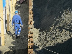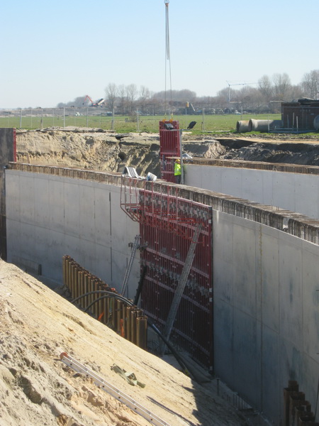 Ja, hier waren we gebleven, bij de tunnelkuip oost… De bekisting wordt verwijderd van moot 3. Verder naar achteren worden de muren in opbouw van moot 1 bekist. (Deze moot 1 blijft open).