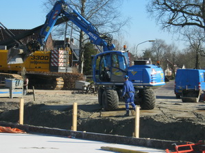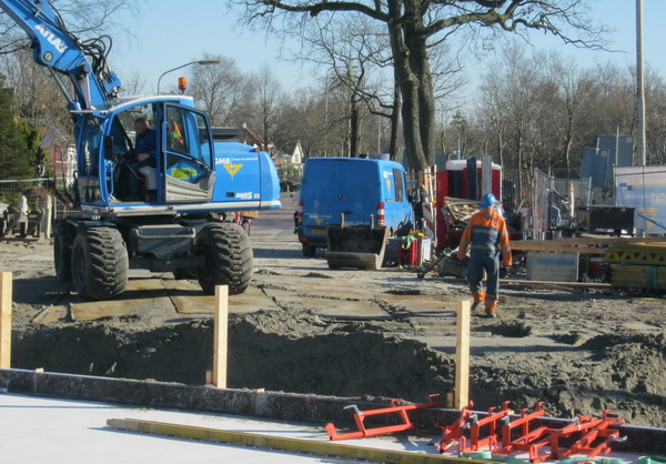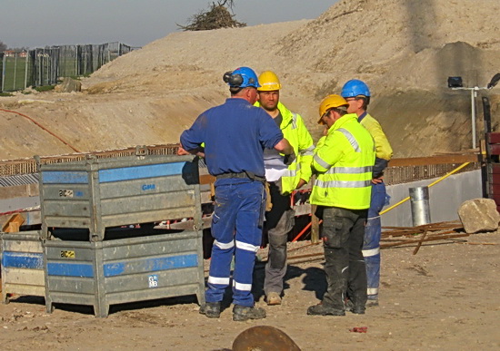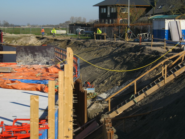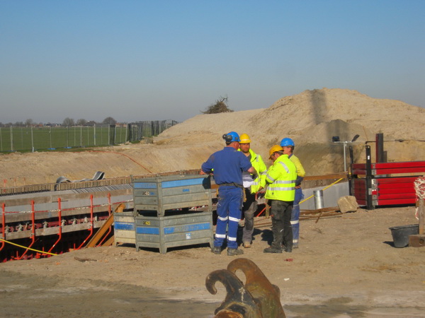 ’s Middags wandel ik nog eens richting tunnelbouw. (Het is inderdaad verslavend…) De zon lijkt wat naar rechts opgeschoven. Verdere hoofdrolspelers blijken dezelfde… Rechts nog net zichtbaar de Staphorster, samen met uitvoerder Johan (in blauwe overall). In de GMB-grijper de onverwoestbare blauwe kapitein… De kraanmachinist zit niet in zijn cabine. Staat hij ervoor??!