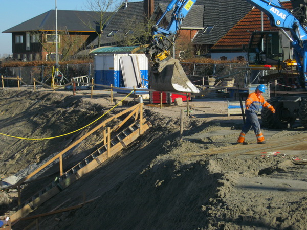 Met de grijper wordt vulzand geschoven in de diepte aan de zuidkant. Zodanig dat de damwandplaten er niet helemaal onder verdwijnen… De platen moeten er nog uit. De Staphorster springt steeds bij, moderne Manus-van-alles, multifunctioneel inzetbaar.