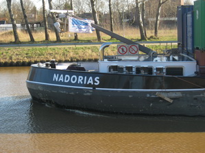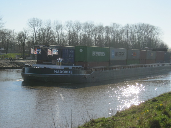 Ommetje via het Van Starkenborghkanaal, waar de grote “Nadorias” (Harderwijk) in tegenlicht nadert. Binnenvaarder van 110 meter lang en een tonnage van 3275! Containervervoer! Als het kanaal dieper en breder is en de nieuwe bruggen hoger, komen er nog grotere voor meer containers….. Wordt ons welbevinden nog groter….