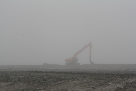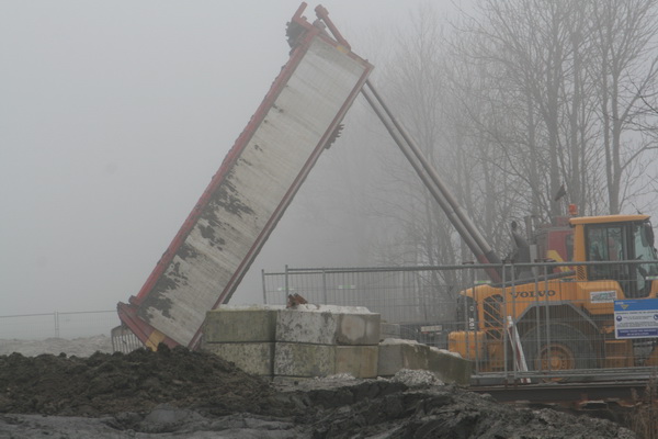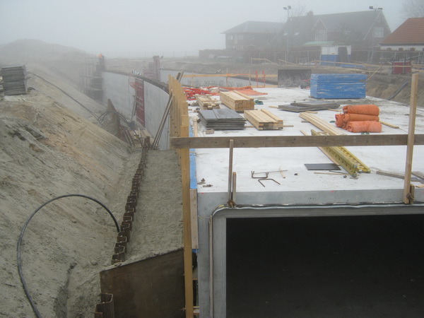 Tunnel in de mist…. Links de damwandplaten die nog in de grond zitten en moeten worden verwijderd, voor de hele ruimte wordt opgevuld (en de grond de druk moet overnemen…) Wat links achteraan gebeurt?