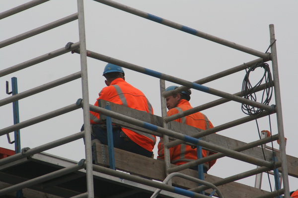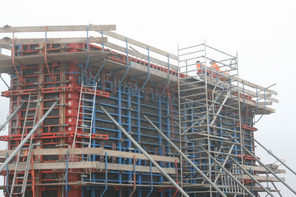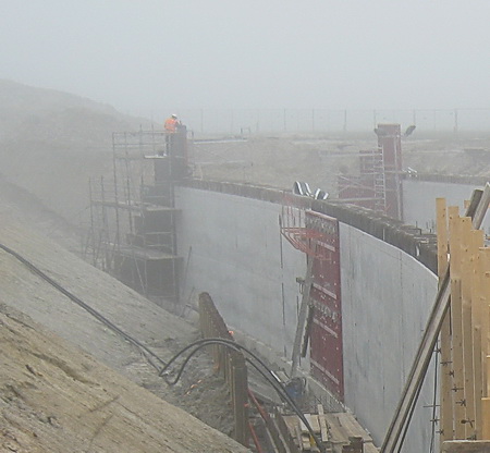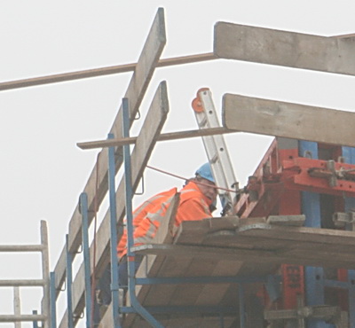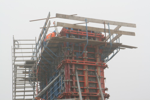 Het bovenste deel van de noordelijke pijler in aanbouw, waar dus nog geen beton kon worden gestort. Het uitstel wordt blijkbaar gevierd met luide, Nederlandstalige muziek… (Ede Staal had hier beter geklonken…)