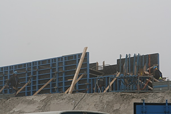 Een machtig bouwwerk, ook met de mistige achtergrond…. Blijkbaar toch zo gecompliceerd dat het niet tijdig gereed kon worden gemaakt voor de betonstort. Dinsdag dan maar……