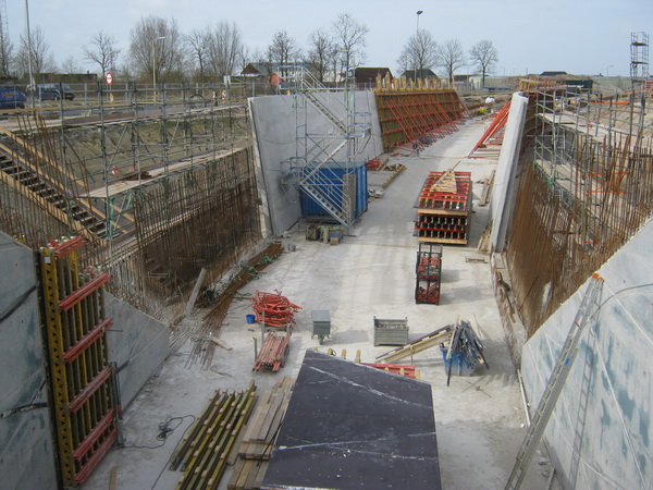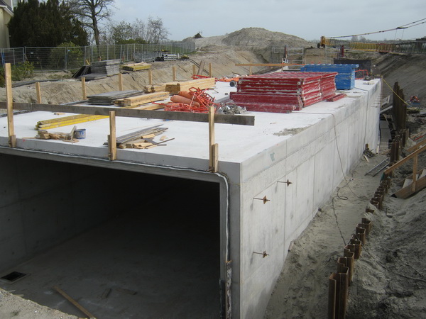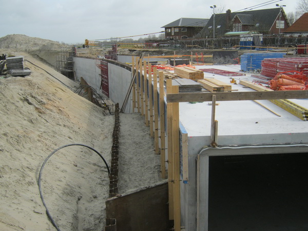 De tunnelkuip oost, maar nu met zicht op de noordkant. Ook hier is al vulzand gebruikt, steken de metalen platen met hun kop boven het zand uit… Net genoeg om ze “beet te pakken”… Aan deze kant zit nog wel bekistingsspul aan de wand, gaat er maandag af…