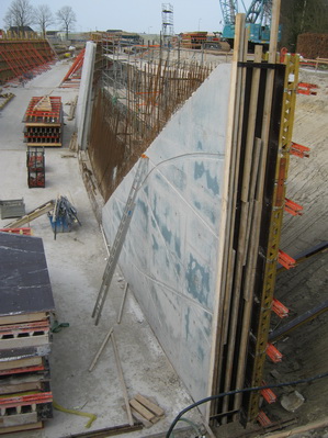 De beide tunnelwanden van moot 6, waar de bekistingspanelen wat moeizaam af gingen… Kwam dat door het reliëf??! Of waren de bekistingspanelen niet voldoende ingestreken met de “olie”, die vastplakken moet tegengaan??!
