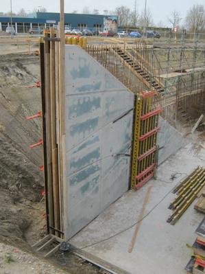 Aan de noordwestkant ziet het beeld er zo uit… De moten 6 tot en met 10… Links en rechts zijn de meeste bekistingen in moot 6 weggehaald… Dat ging niet zonder slag of stoot (Daarover later meer op www.bloeiendonkruid.com) Ook op deze tunnelwanden is reliëf aangebracht. Betekenis: De lijnen van de doorsneden grondlagen….