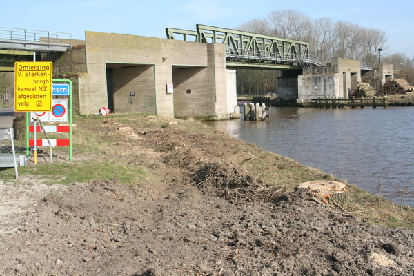 De bomen zijn inderdaad gekapt om de bouw van de nieuwe spoorbrug mogelijk te maken. Ze zijn nu gekapt, omdat ze onder de kapvergunning van de bochtverruiming vallen. Bovendien moet de activiteit voldoen aan de richtlijnen flora en fauna, hetgeen betekent dat de bomen voor het begin van het broedseizoen moeten zijn verwijderd. Er gaat nog meer groen verdwijnen langs de spoorbaan en ook bij de tennisbaan aan de zuidzijde. De verwijdering van dit groen gebeurt pas kort voor de feitelijke uitvoering van de spoorbrugvervanging (winter 2014-2015). Er wordt nog een kapvergunning aangevraagd voor de zuidoostzijde van de spoorbrug en voor “het verloop van de zuidoever naar de beweegbare brug”. De gemeente Zuidhorn maakt een nieuw groenplan voor de hele zuidoever, een en ander in overleg met o.a. de tennisvereniging. Dat groenplan wordt onderdeel van het spoorbrugproject.