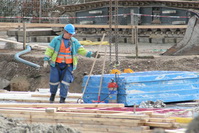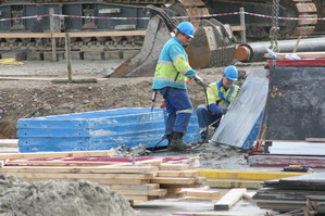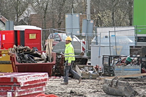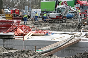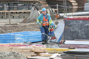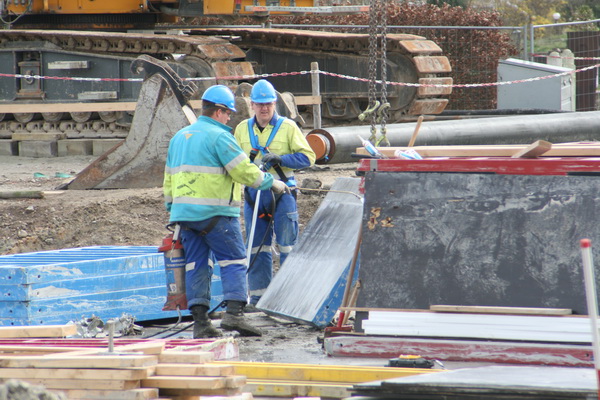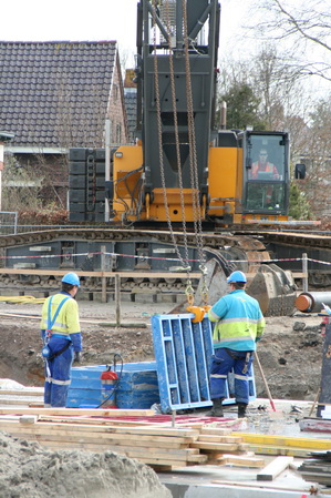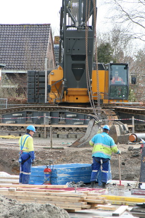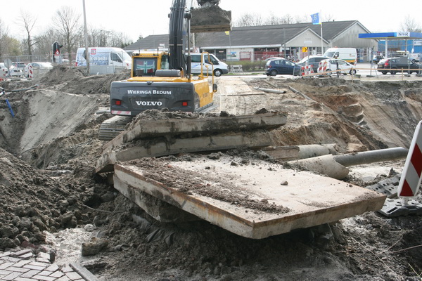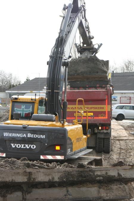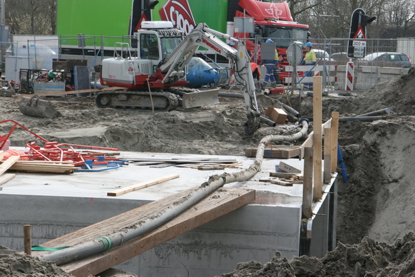 Ingewikkelde toestand… De waterafvoer loopt tijdelijk over moot 4…. De kleine grijper is aan de zuidkant van moot 4 grond aan het verplaatsen. De tussenruimte wordt gevuld en aangestampt….