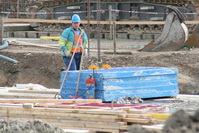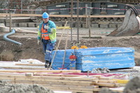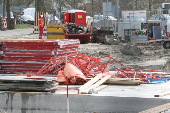 De bekistingspanelen worden per stuk naar hun plaats van bestemming getild…..