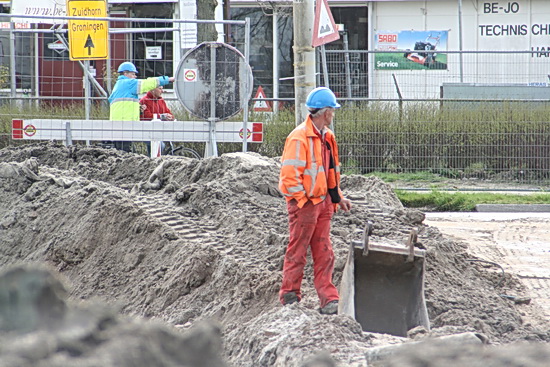 Beelden vanuit de tijdelijk doodlopende Langestraat Zuid bij de Kruizinga’s voor de deur. De nieuw ogende VOLVO-grijper van Wieringa uit Bedum is begonnen met weggraven van de oude noodverbinding met de N355 en de Industrieweg. De grond wordt in snel tempo afgevoerd door Zwama-auto’s. Bestemming?