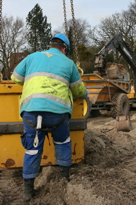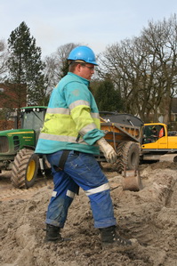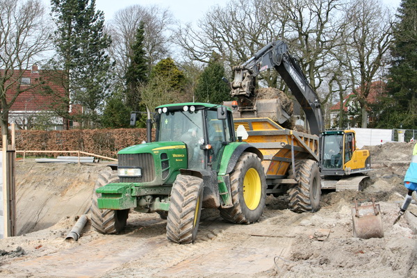 Als je ook zo druk in de weer bent als deze Volvo-graver, verbruik je ook heel wat brandstof! Hier wordt de Wieringa-kiepkar volgegooid, met weggegraven grond. Ontstaat de ruimte voor de ontbrekende moot 5!
