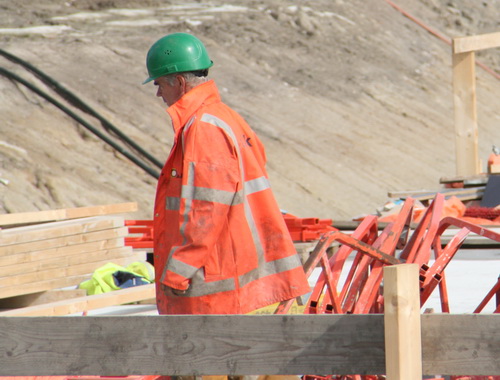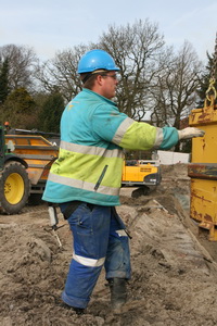Aha, een groene helm! In de voorbije maanden waren die groene helmen vaak voorbehouden aan de mensen van HAK. De vaklui die zich bezig hielden en houden met het (ver)leggen van leidingen…. Hier ook?!
