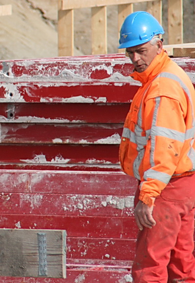 De Staphorster komt in beeld, rechtsonder. Meestal heeft dat een positieve invloed op wat er aan de gang is… Zonder opsmuk of bombarie regelt hij zijn klussen en heeft blijkbaar indirect ook invloed op klussen van anderen, want even later is het bekistingsdeel getemd…