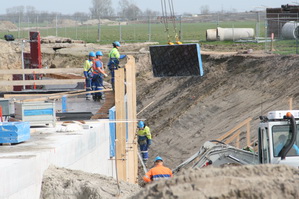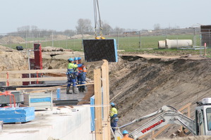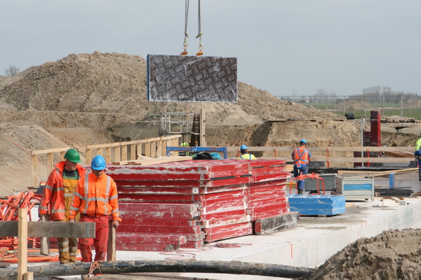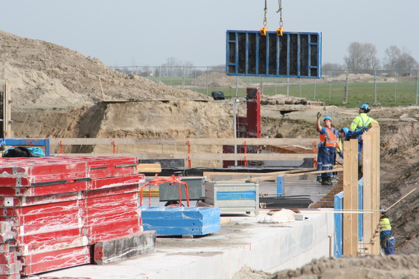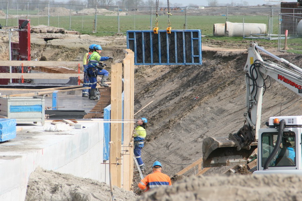 Boven de tunnelkuip aan de oostkant (de moten 4 tot en met 1, van voor naar achteren) hangt een bekistingspaneel, bedoeld voor de rand van het dak van moot 3. Daar komen aanstaande vrijdag 28 maart de betonstorters, als alles volgens planning verloopt. (Zie het weekbericht van Yvonne Arnst). Op de voorgrond leidt grondkundige Mulder ‘de groene helm’ rond. Iemand van Hak denk ik die zich vooral om kabels en andere leidingen bekommert. (Nee, geen groente….)