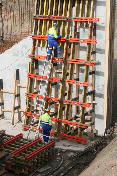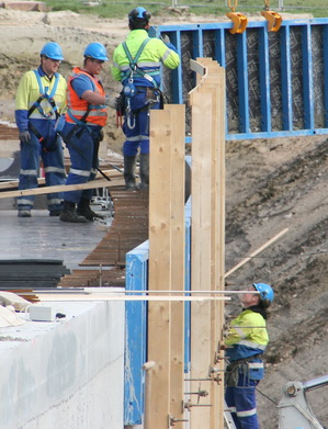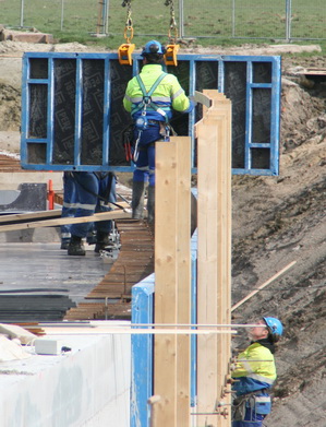 Het bekistingsdeel wordt door allrounder Henk (?) en collega in ontvangst genomen. Rechts, aan de buitenkant, een andere GMB-timmerman die meewerkt aan het bevestigen van deze bekisting.