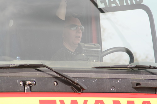 Intussen zit iets verderop de chauffeur van de Zwama-kiepauto in zijn cabine, zonnebril op. En communicerend… Of lijkt dat maar zo?