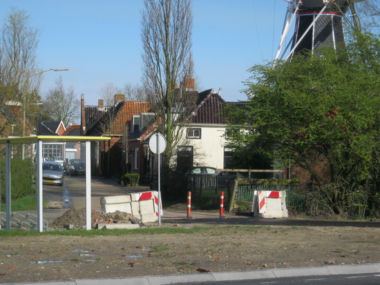 Vanaf de westkant van de N355 een foto gemaakt van de Schippersstraat. In beeld de concretisering van maatregelen om sluipverkeer tegen te gaan. Links de werkloze abri, waar blijft de nieuwe bushalte???!