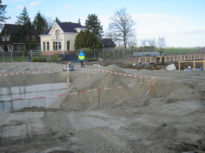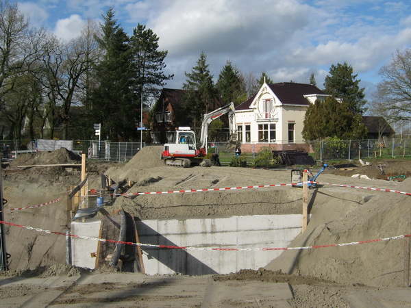 De situatie bij moot 4, waarover de nieuwe Langestraatverbinding wordt aangelegd. De GMB’er die regelmatig de kleine Wieringa-grijper bestuurt, loopt over het tunneldeel richting huize Wieringa. Gevolgd door een kiepwagen met vulzand. Het tunneldak houdt! (Geruststellend!)