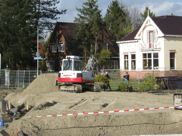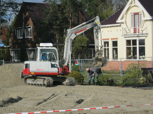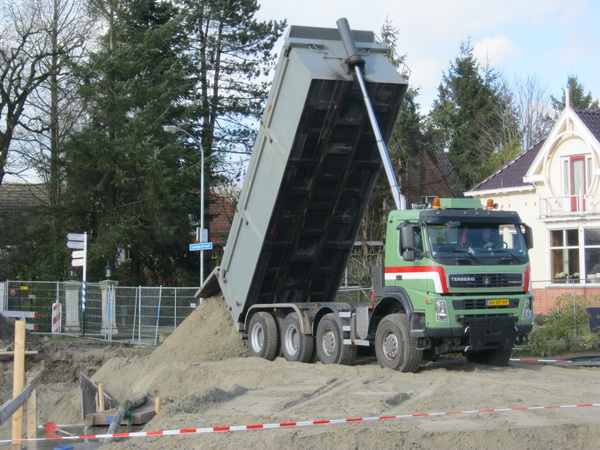 De kiepwagen lost zijn zand dicht bij de afrastering, schuin voor het pand van de Kruizinga’s. Er kan nog wel wat meer bij….
