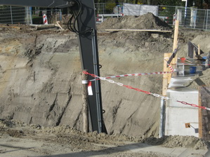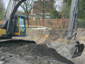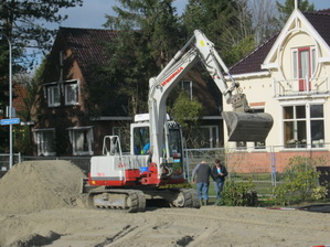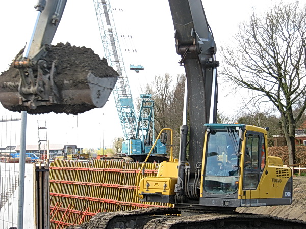 De Volvo-arm met de vulbak gaat wederom de diepte in en verdwijnt uit het zicht…. Er is een gigantische kuil gegraven in enkele dagen tijd…. Wie herinnert zich nog de noodweg die Langestraat Zuid met de Industrieweg verbond??? (Even terugscrollen naar voorgaande blogs….)