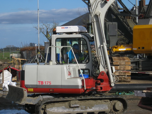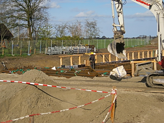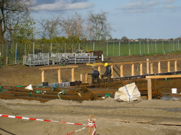 Van rechts komt de kleine Wieringa-grijper die het gebrachte vulzand te lijf wil… “Wacht maar, ik maak je met de grond gelijk!” Op de achtergrond twee doorzettende staaldraadvlechters, die deze dag eindelijk weer de zon zien en ervan genieten…