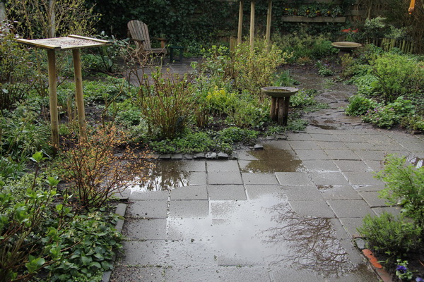 Ook onze achtertuin kreeg een deel van de regenval. Even is het extra nat, maar de tuin kan het water wel aan. En de waterbakken zijn dan ook meteen weer gevuld!