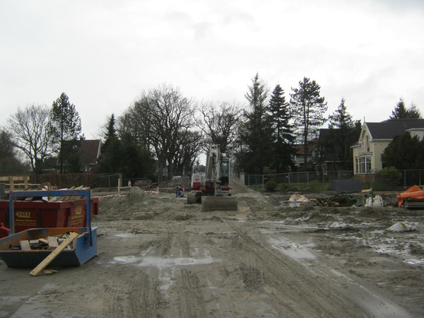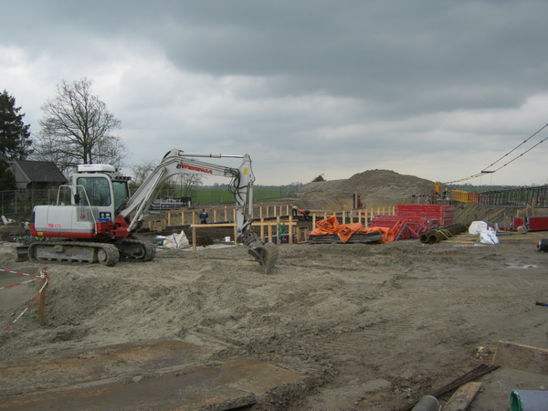 Het is nog niet zo lang droog, de capuchon is nog in functie… Wat daar links op de bult ligt? Zouden de bouwplaatsmedewerkers daar een Paasvuur organiseren? (Zij weten niet dat die in Noordhorn altijd op de oude ijsbaan wordt opgebouwd…)
