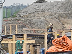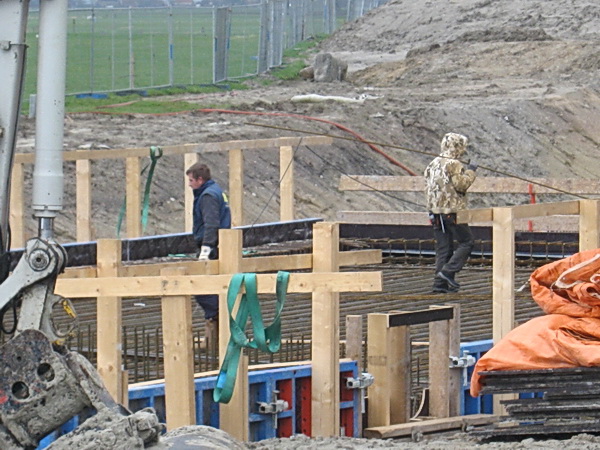 De blik (en de lutje Canon) oostwaarts gericht, moten 4 tot en met 1, met afsluitende bult… Hé, kijk, er zijn nog enkele vlechters aan het werk, niet de hele ploeg. Diehards? Het helpt in ieder geval om de wapening klaar te krijgen voor komende vrijdag (28 maart) de betonauto’s bij de poort staan…