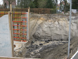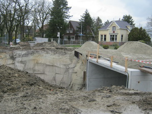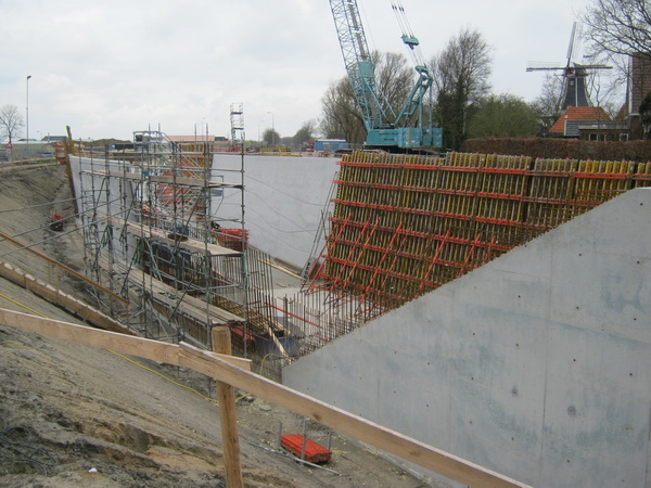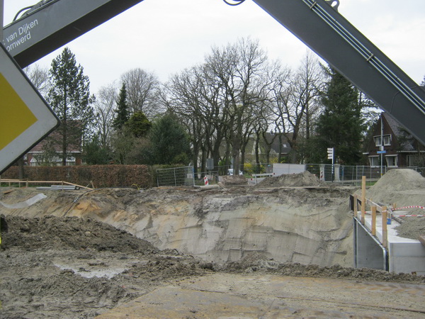 Nee, er wordt niet resoluter, minder omzichtig gegraven in moot 5 (i.v.m. eventuele archeologisch waardevolle vondsten) dan voorheen bij de start van het tunnelgraafwerk. De aansluiting van de ‘noodweg’ over moot 4 op de oude N355 is inmiddels bekend, ik krijg een tekening hiervan gemaild. (Maar zo’n tekening goed ‘lezen’ en ‘vertalen’ is een kunst op zich…) Moot 1 krijgt inderdaad rechte wanden, in tegenstelling tot het andere eind van de tunnel, waar de moten 7 tot ne met 10 schuine wanden krijgen. Wel komt er ook op de wanden van moot 1 een reliëf. En deze wanden steken verder de lucht in dan de muren van de nabijgelegen moten… Bij moot 5 komen geen damwanden in de grond. Wel wordt er ter versteviging gewerkt met “Big Bags”, grote zandzakken. Waterafvoer vindt plaats via twee verschillende systemen. Het water in de tunnel wordt anders afgevoerd dan het water dat buiten de tunnel wordt opgevangen. Het wat “ziltige” water gaat naar het riool, het andere water naar een poldersloot. (Systemen met leidingen, pompen, waterreservoirs etc. Ik vertel het niet na, want dan maak ik fouten, gaat het water linea recta terug, de hemel in…)