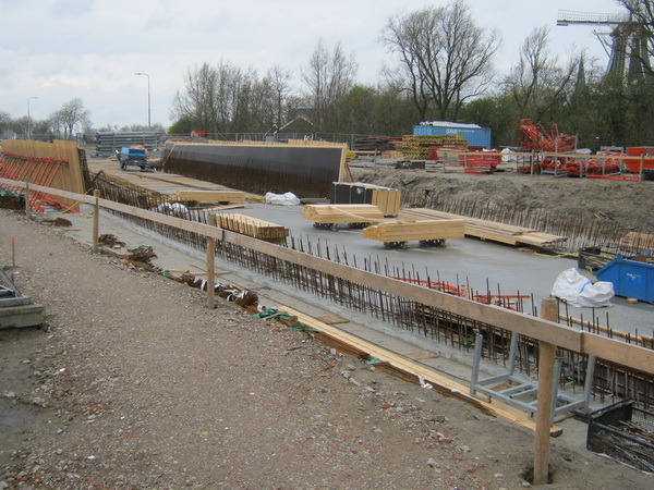 Moot 9 heeft nog geen voltooide wapening noch bekisting. Bij moot 10, verderop, zijn ze al verder…. Voor deze werkvolgorde is ongetwijfeld een sluitende verklaring, dat zal ik nog eens vragen…