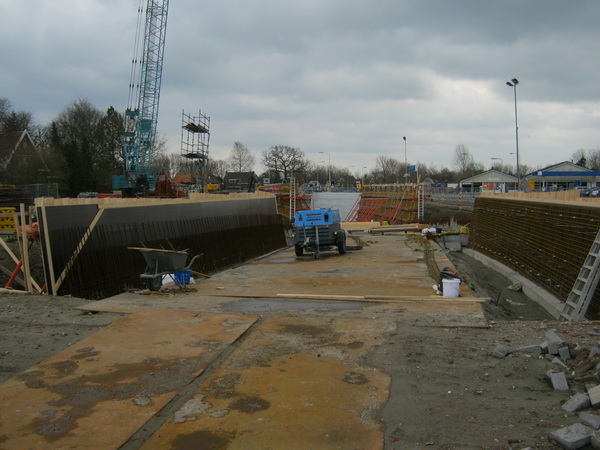 Van zuid naar noord, de plek waar de ‘noodweg’ wordt aangelegd over moot 4 van de tunnel. Voor snelverkeer wordt het alleen het dorp in, mede op advies van de politie, vandaar dat de weg ‘slechts’ 4 meter breed wordt. (Aanvankelijk zou de weg 6 meter breed worden).