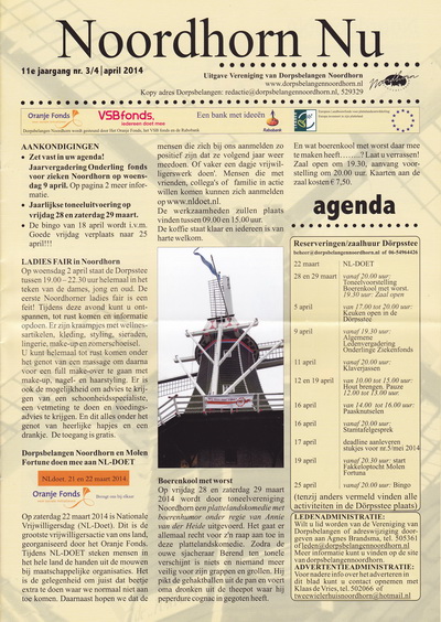 “Noordhorn Nu“, het maandelijkse orgaan dat bekender is als “het gele krantje“, is als een feniks uit zijn as herrezen… Na de ongelukkige manier waarop het bestuur van de handelsvereniging “Fortuna” het einde van dit blad aankondigde, is er nu een solide wedergeboorte. Het fundament is anders, de handelsvereniging heeft er als zodanig niets meer mee te maken. De uitgave valt nu onder de paraplu van Dorpsbelangen Noordhorn (net als de hertenkampcommissie en de molencommissie) met als advertentie-coördinator Klaas de Vries (van het Tweewielerhuis). Hij is er stug doorzettend in geslaagd een stevige, financiële basis te creëren door het binnenhalen van vele advertenties. Knap werk! Anyk de Jong blijft als redacteur de 4 Dorpsbelangen-bladzijden voor haar rekening nemen, zelf heb ik me (“voor onbepaalde tijd”) ontfermd over de pagina’s 5 tot en met 8, de vertrouwde invulling van de ‘oude’ Noordhorn Nu. Het kostte even extra tijd om alles goed uit de verf te laten komen, vandaar dat het recente nummer (maart/april 2014) een dubbele nummering kreeg: 11e jaargang, nummer 3 en 4. Vanaf mei op de oude voet verder, met nieuw elan werkend aan een verbeterd blad, mede dankzij Grafidrukker Lex van Gaans (Grijpskerk). Nu is er kleurendruk mogelijk, waardoor vele foto’s beter uitkomen. Dat niet alleen: De advertenties zien er bijzonder geslaagd uit! Zo’n uitgave is het waard om te worden voortgezet, we doen ons best! (JB)