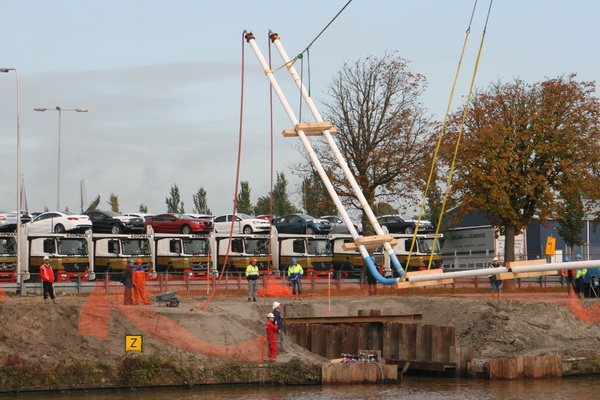 Beeld van de verzinking van de nieuwe buizen van Gasunie en Enexis. Deze komen dieper te liggen dan de nu functionerende. De groeiende scheepvaart, ook wat de diepgang van de boten aangaat, maakt een diepere ligging van de leidingen noodzakelijk. De verzinking van de nieuwe buizen vond plaats op 6 oktober 2013. Als alles goed was gegaan, waren de oude buizen al verwijderd en de nieuwe in gebruik genomen…. Eigenlijk zou de kanaalweg bij het parkeerterrein van Koopman Transport al weer opengaan op 15 november 2013…. Een lang stilzwijgen en het gestremd houden van de weg wakkerden de geruchten aan. In ieder geval is er sprake van beschadigingen aan de buitenkant van de buizen die nader onderzoek onvermijdelijk maken. Dat betekent dat het kanaal weer op een bepaald moment moet worden gesloten voor alle scheepvaart en dat kan alleen maar als daarvoor vroegtijdig een vergunning wordt aangevraagd.