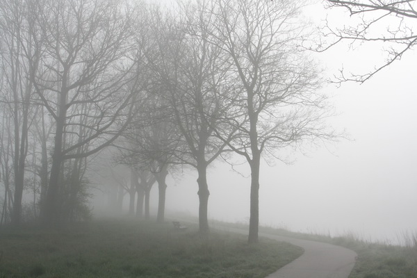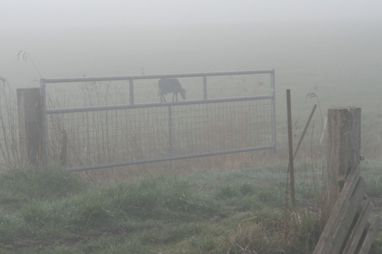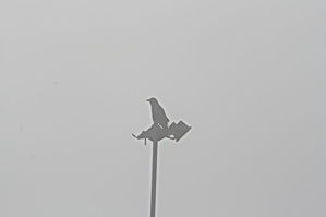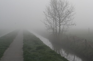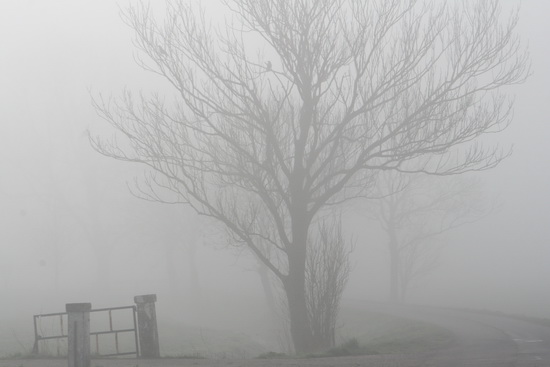 Aan de Spanjaardsdijk Noord is de mist nog steeds volop aanwezig. De kraaien voelen zich toch enigszins gedesoriënteerd…