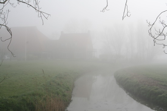 Direct buiten het dorp is de natte grijsheid nadrukkelijker aanwezig….