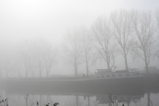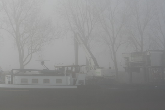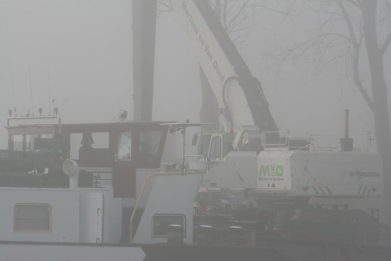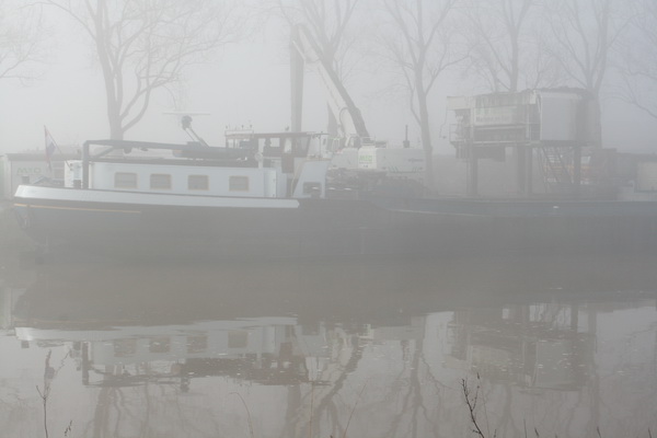 De plek aan de zuidelijke oever, waar nu baggergrond wordt aangevoerd per schip. De Martens en Van Oord-grijper ontscheept, maar nu nog niet… Vanwege de mist?