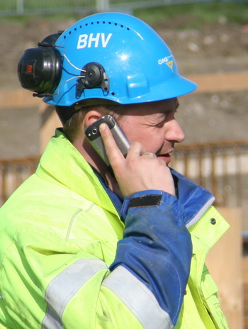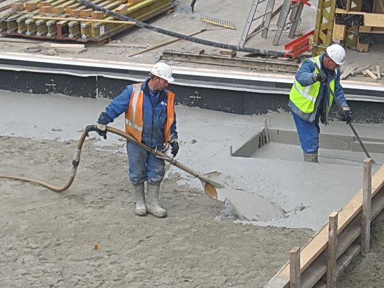 Kijken doe ik… En kieken ook! Beneden in moot 5 zijn twee betonwerkers bezig met het spuiten van schuimbeton.