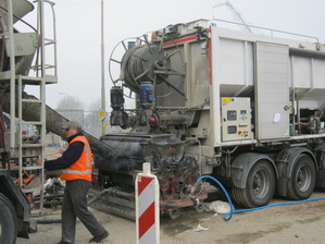 De toeziende chauffeur (“Je moet het wel in de gaten houden!”) vertelde dat het om schuimbeton ging. In de tank van de betonwagen zat deze keer zo’n 7½ kuub, maar, zei hij, “deze schuimbeton, daar wordt lucht aan toegevoegd” via de rijdende ‘fabriek’ van Faber, en dan kan het wel uitdijen tot het dubbele…. Schuimend wordt het dan op de vloer ‘gespoten’. Bedoeld als onderlaag. Wordt snel hard en vormt dan een goede onderlaag voor de wapening, waarna er beton kan worden gestort. “Ga maar eens kijken!”