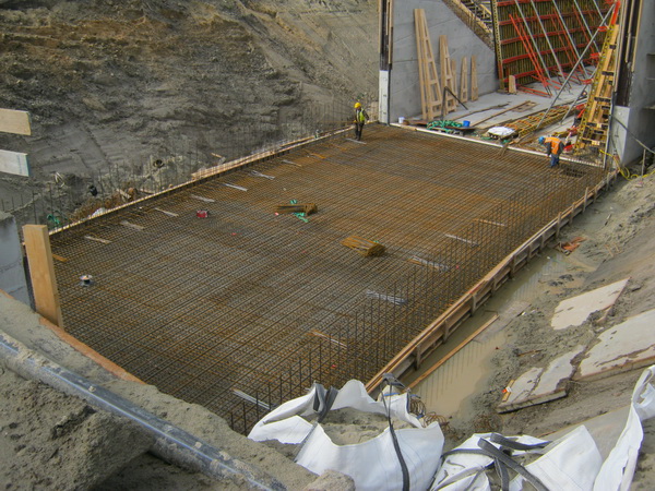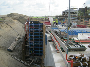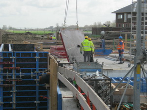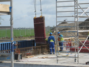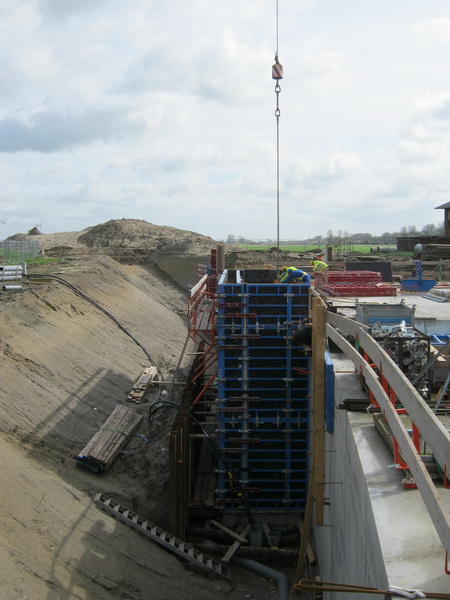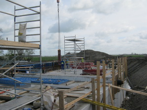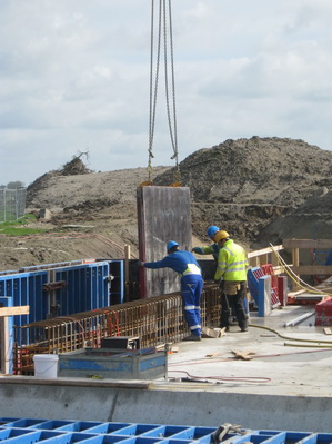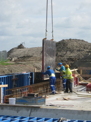 Activiteit aan de oostkant, bij de opbouw boven de pompkelder. Er gaat nog steeds bekisting naar binnen, dan moeten de betonstorters nog even geduld hebben…. Of die winkelrekken er zijn neergezet om het fotograferen te bemoeilijken?! Dat dacht ik toch niet….. Alhoewel… Waarvoor dienen ze dan wel??!