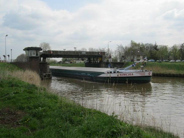 Op mijn rondje, waarbij steeds een gedeelte langs het Van Starkenborghkanaal voert, zie ik de “Simcha” de oude verkeersbrug passeren. Wederom zo’n binnenvaarder met maximale afmetingen (als de vaarweg helemaal verbeterd is, komen er nog grotere…)!