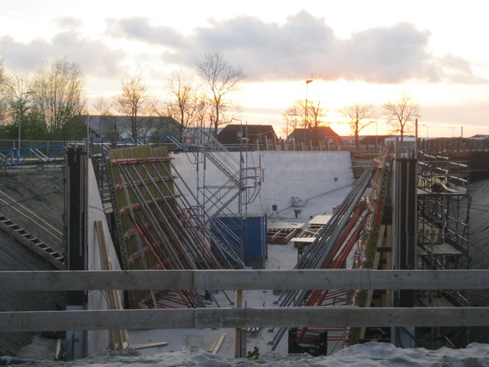 De tunnelmoten beginnen steeds duidelijker een gesloten geheel te vormen. René staat op de achtergrond te assisteren bij het ‘verzenden’ van bekistingsdelen… Komende donderdag 17 april a.s. (Normaal Witte Donderdag genoemd, nu “Betondonderdag”) wordt zowel het beton gestort voor het dek van moot 2, als voor de wanden van de opbouw van de pompkelder. Die dag is de noodweg helemaal afgesloten voor ALLE verkeer, dus ook voor fietsers.