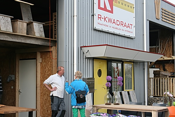 Meubelmaker Robert Runhardt bij zijn R-Kwadraat, in gesprek met een belangstellende dorpsgenoot…