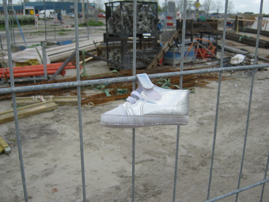Een (ballet?)schoentje aan het hek bij de ‘noodweg’ op het tunnelterrein. Nou ben ik niet bijster thuis op het gebied van voorwerpensymboliek. (Ik begrijp de krans oook niet zo goed die al maanden op een andere plaats aan het hek bungelt…) Heeft dit een exclusieve betekenis? Of is het een gevonden voorwerp dat hangend wacht op de rechtmatige eigenaar?!