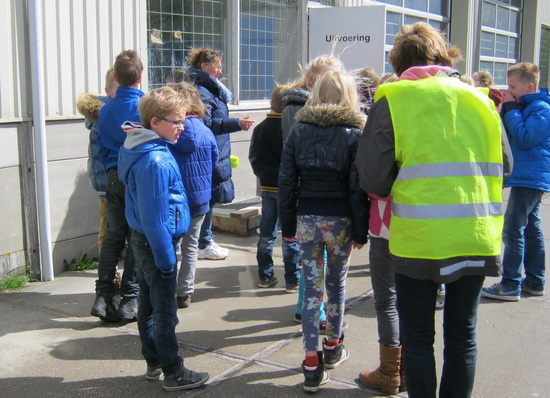 Kinderen en begeleiders op weg naar de ontvangst bìnnen, via de deur met opschrift “Uitvoering”. De stoelen stonden al klaar, inleider en begeleider Janko Haaksema was nog even met technische voorbereidingen bezig. Geen probleem, kinderen, meester en ouders hadden na de stevige trap tegen de wind in wel even behoefte aan enkele seconden rust….