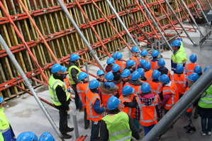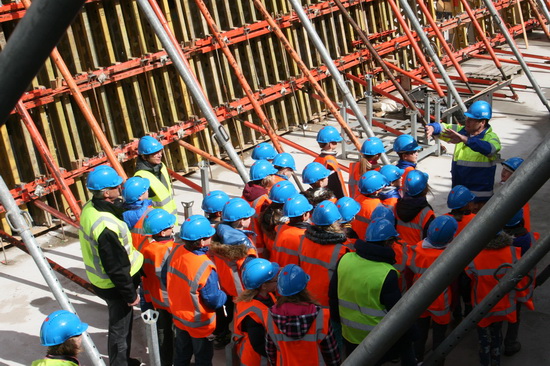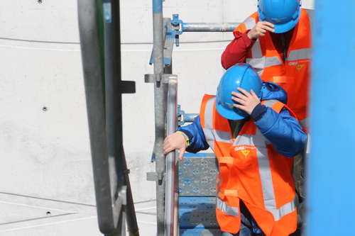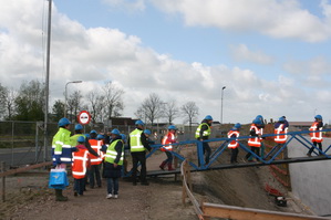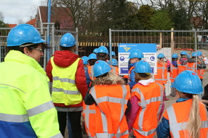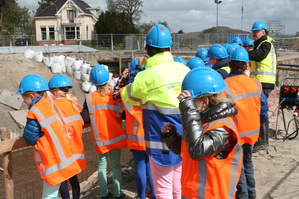 Prachtig gezicht, de kinderschare met begeleiding, allemaal in opvallende hesjes en veiligheidshelmen in de huiskleur van GMB. Pas op, hou de helm vast! Waait zo af!