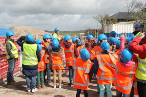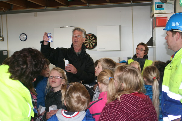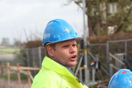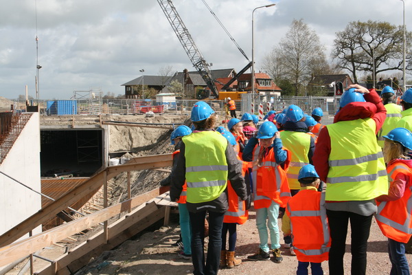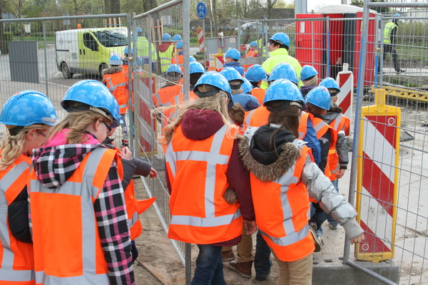 Heerlijke dag, deze zonnige woensdag met aangename temperatuur. Niet meer de stormachtige wind uit noordelijke richting die afgelopen maandagmiddag de kinderen van groep 6 (GBS “De Brug” Zuidhorn) bijna ‘onthelmde’ tijdens hun bezoek aan het tunnelterrein bij de Langestraat Zuid. Ook de begeleidende moeders en meester Henk moesten attent blijven, net als GMB-secretaresse Pia en de kieker/schrijver van deze blog… Alleen aanvoerder Janko Haaksema, in het dagelijkse GMB-leven uitvoerder/woordvoerder/omgevingsmanager, maar nu educatief medewerker, leek geen “Oeps-daar-gaat-mijn-helm-angst” te kennen… Bij hem zat het blauwe hoofddeksel als gegoten, waarschijnlijk gewenning. Met de helm op geboren?!