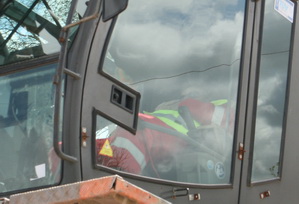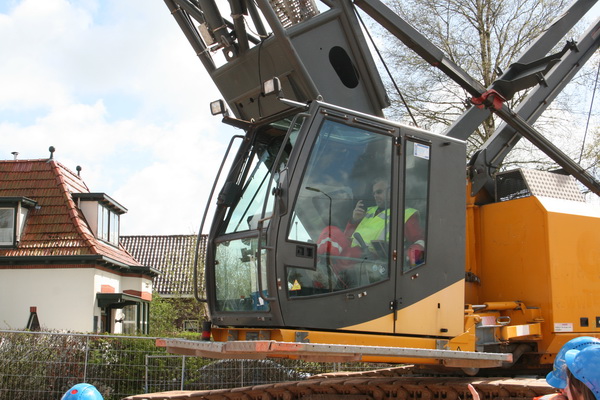 Ja, die kant gaan we ook nog even op, naar die reuzen kraan! Wel achter meneer Haaksema blijven, we moeten de weg over! In de verte blijft de meter van Geomaat cijfermateriaal verzamelen. Een belangrijke ploegspeler, al lijkt hij voornamelijk te soleren…